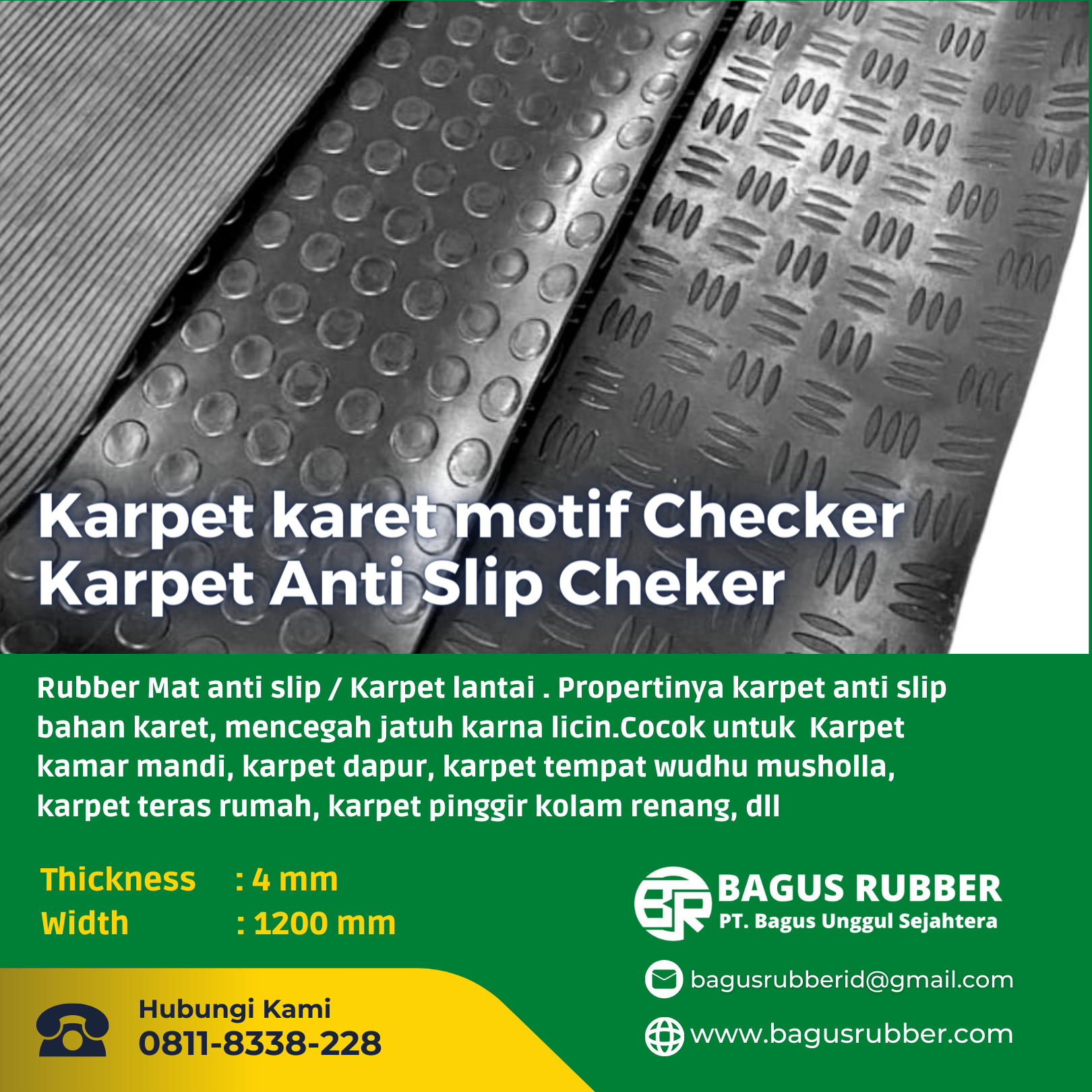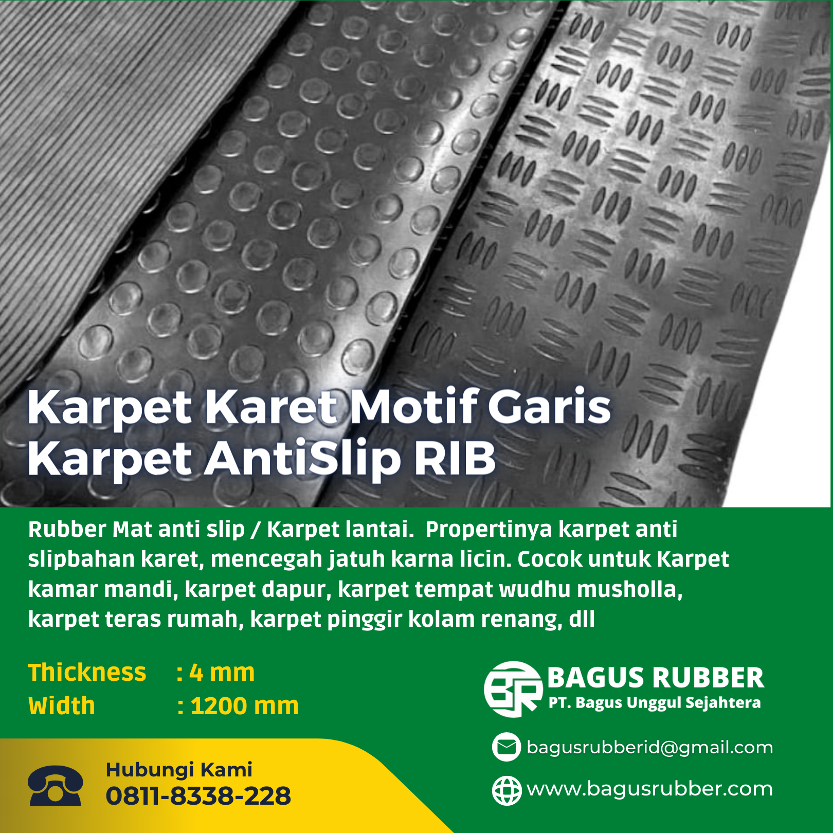 Lantai karet atau karpet lantai . Bagus Ruber menyediakan berbagai macam produk Antislip Rubber Mat bahan berkualitas dan harga yg kompetitif. Product antislip kami Karpet karet Motif Coin/Karpet  AntiSlip Coin ,Karpet karet motif garis/ Karpet AntiSlip RIB, Karpet karet motif Checker / Karpet Anti Slip Cheker, Rubber Mat / Karpet Anti Slip, Rubber Mat / Karpet Anti Slip, Rubber Waterhog Mat / Karpet Anti Slip Welcome ,karpet Kandang Sapi,  Karpet Nomad